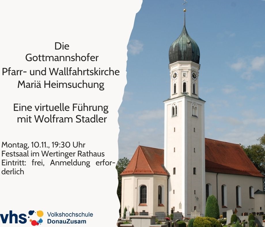Kommen Sie mit auf einen virtuellen Streifzug durch die Gotttmannshofer Kirche! Wolfram Stadler informiert an diesem Abend über die Geschichte und Besonderheiten der Pfarr- und Wallfahrtskirche, die 2024 das 350-jährige Jubiläum ihrer Einweihung feierte. Anlässlich dieses Jubiläums verfasste Wolfram Stadler einen neuen Kirchenführer. Der Ursprung des Gebäudes geht bis in die Romanik zurück. Der Bau wurde im 17. Jahrhundert (1673/74) vergrößert und erhielt im zweiten Drittel des folgenden Jahrhunderts die Rokoko-Innenausstattung. Die Stuckierung der Kirche stammt von Franz Xaver Feichtmayr, während Johann Baptist Enderle die Fresken schuf. Hochaltar, Seitenaltäre und Kanzel wurden in Wertingen in der Schreinerei Amann gefertigt. Bekannt ist das Gnadenbild , das um 1480 entstand. Der Referent geht auch auf die Besonderheiten ein, z.B. warum die Gottmannshofer Kirche fünfzehn Kreuzwegstationen besitzt statt der üblichen vierzehn. Der Eintritt ist frei. Eine Anmeldung bei der vhs ist aus organisatorischen Gründen unbedingt erforderlich. Anmeldungen sind unter den Telefonnr. 08272 84180 und 84181 möglich, zur Online-Anmeldung geht es hier: Anmeldung Virtuelle Kirchenführung