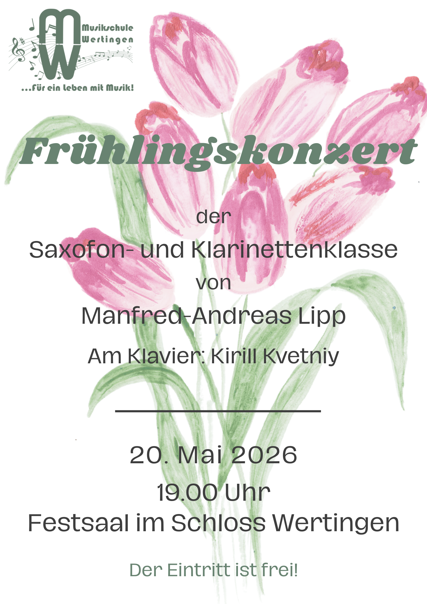 Am Mittwoch, 20. Mai 2026, 19.00 Uhr, findet das „FRÜHLINGSKONZERT-Junge Künstler 2026“ der Klarinetten- und Saxofonklasse von Manfred-Andreas Lipp aus der Musikschule Wertingen im Festsaal des Wertinger Schlosses statt. Die Klavierbegleitung übernimmt der Pianist und Musiklehrer Kirill Kvetniy aus Augsburg.