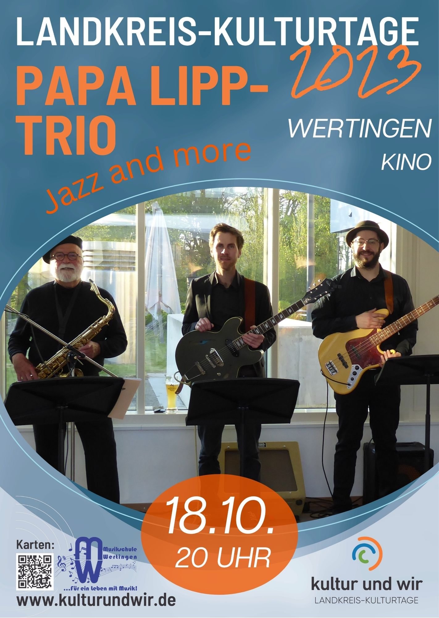 Manfred-Andreas Lipp spielt mit seinen Kollegen Florian Hirle und Helmuth Baumann ein Repertoire aus der Geschichte des Jazz. Alle drei Künstler sind neben ihrer Tätigkeit als Musiklehrer an der Musikschule Wertingen auch auf vielen Bühnen präsent.