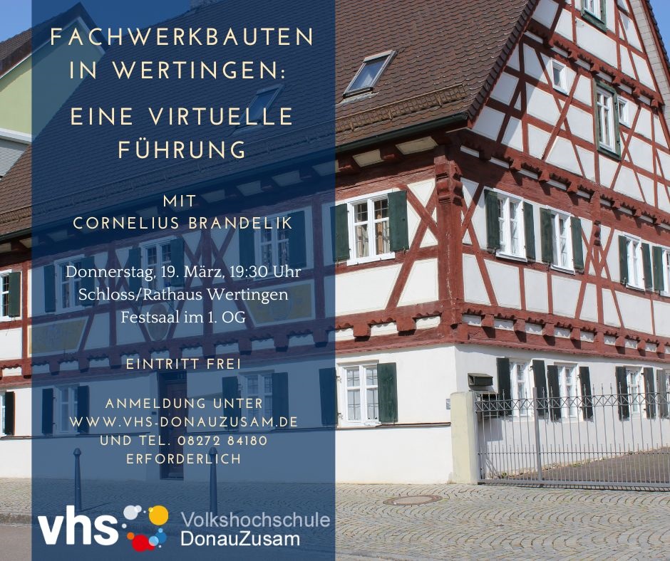 Wenn man an prächtige Fachwerkhäuser denkt, fallen meist Namen wie Rothenburg, Dinkelsbühl oder Nördlingen. Doch man muss nicht weit reisen, um historische Skelettbauweise zu bewundern: Auch Wertingen verfügt über Fachwerkbauten, die oft im Verborgenen glänzen. Am Donnerstag, 19. März nimmt Sie Cornelius Brandelik, Museumsreferent der Stadt Wertingen, ab 19:30 Uhr im Festsaal im Wertinger Schloss mit auf einen virtuellen Rundgang durch Wertingen und zeigt Ihnen die historischen Schätze in unserem Städtle: Vier markante Fachwerkhäuser, die in der Zeit zwischen 1650 und 1700 entstanden sind, zeugen von der Handwerkskunst vergangener Jahrhunderte. Ergänzt wird das Stadtbild durch zwei prachtvolle Fachwerkgiebel aus dem 19. Jahrhundert. Und dann gibt es in der Pheripherie noch jüngere Fachwerkbauten aus dem 20. Jahrhundert. Der Referent beleuchtet detailliert die spezifische Bauweise, die konstruktiven Besonderheiten und die individuelle Gestaltung. Der Vortrag bietet somit eine neue Perspektive auf das vertraute Stadtbild und lädt dazu ein, die architektonische Identität Wertingens neu zu entdecken. Der Eintritt ist frei, aus organisatorischen Gründen ist eine Anmeldung bei der vhs Zusamtal Wertingen-Buttenwiesen e.V. erforderlich. Zur Anmeldung im Internet geht es hier: Anmeldung Virtuelle Führung, telefonisch können Sie sich unter 08272 84181 und 84180 anmelden.