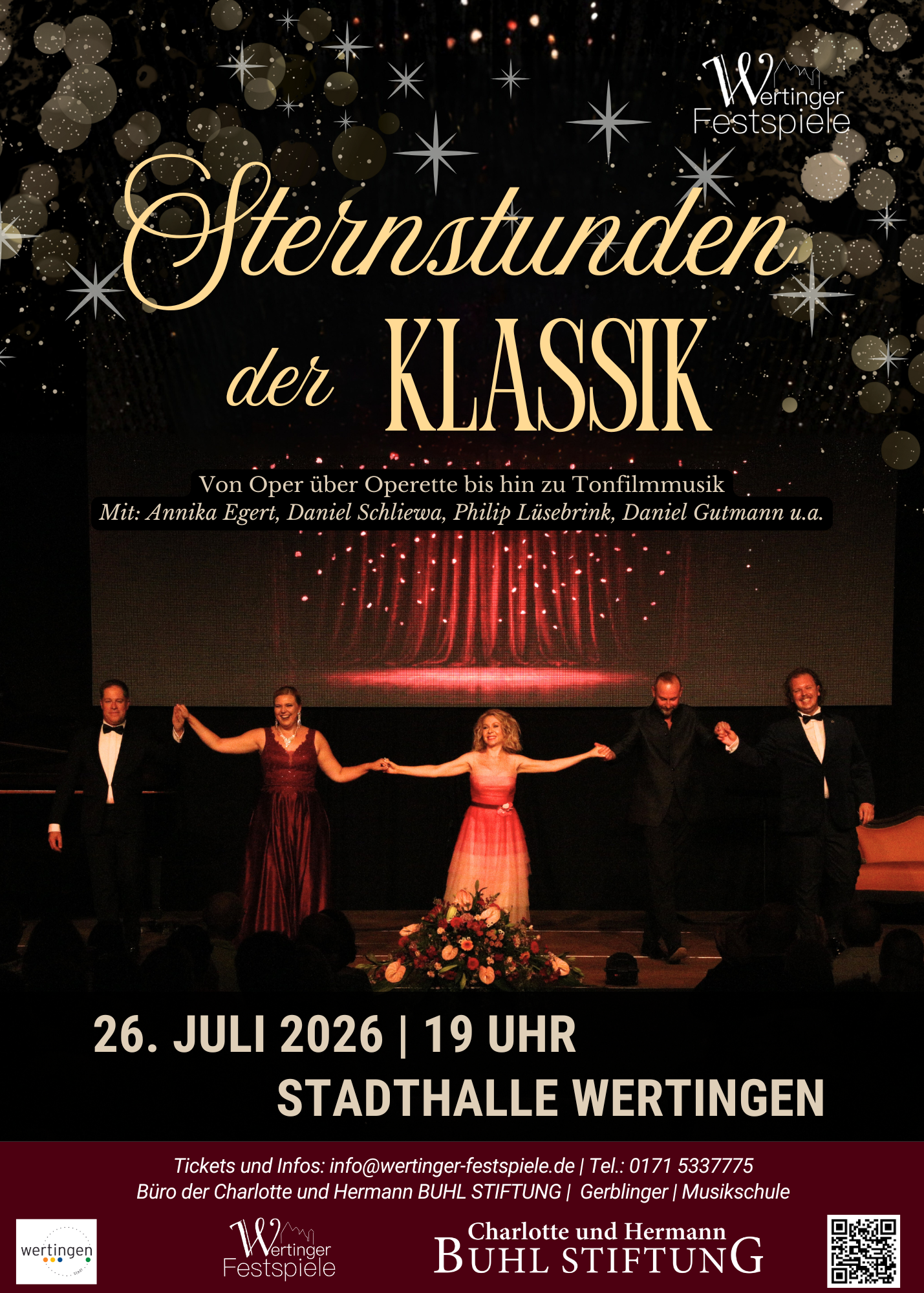 Das Programm vereint beliebte Werke großer Meister, die von Freude, Hoffnung und Leidenschaft erzählen. Präsentiert in festlicher Atmosphäre, spiegelt es den besonderen Geist der Wertinger Festspiele: Klassische Musik, die lebendig, nahbar und für alle erlebbar ist. Ein Finale, das zeigt, warum Wertingen längst als Musikstadt einen Namen hat. Doch „Sternenstunden der Klassik“ ist mehr als nur Musik: Es ist unser Dank an das wunderbare Publikum, das die Wertinger Festspiele jedes Jahr zu etwas Besonderem macht. Erst durch die Begeisterung, die Freude und die Treue unserer Besucherinnen und Besucher wird Wertingen zu einer echten Musikstadt, die mittlerweile über die Region hinausstrahlt.
